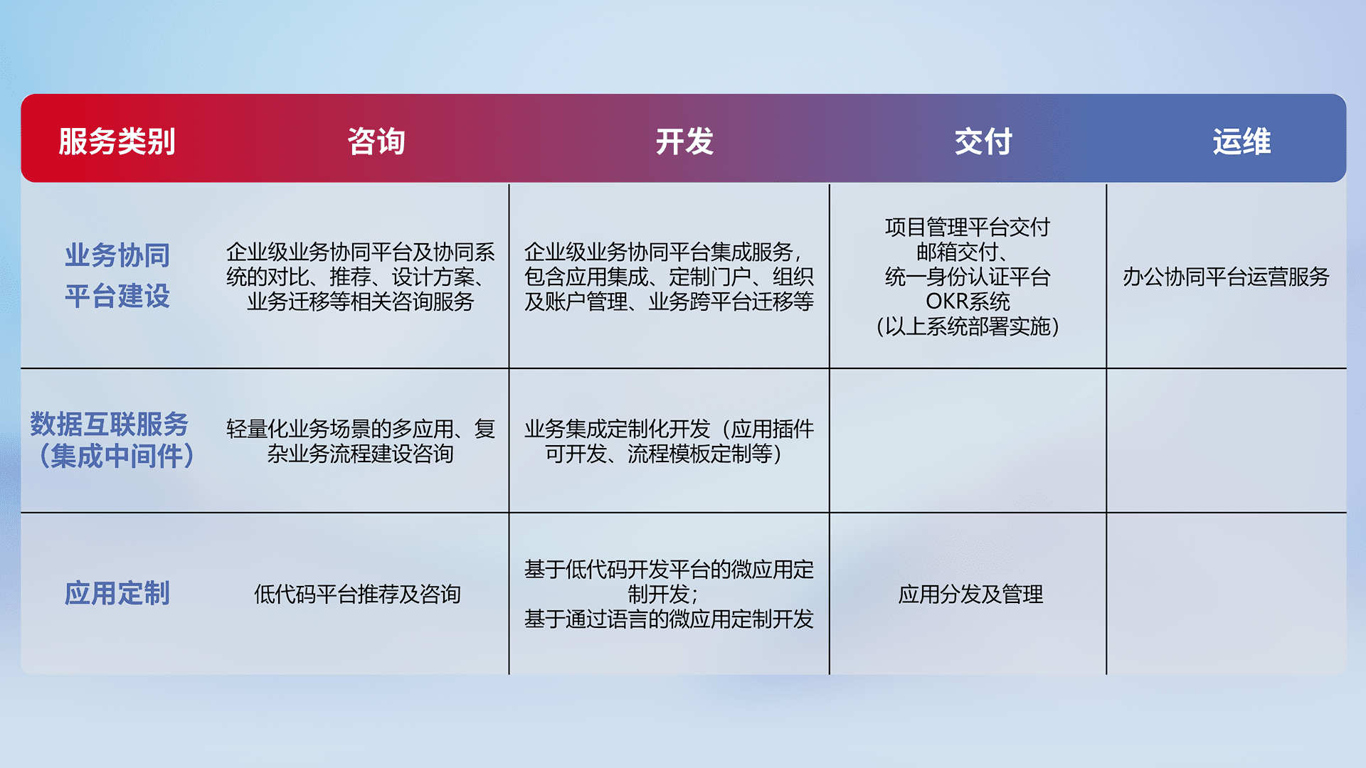 针对钉钉、、、企微、、、、IDaas等平台级产品提供产品的规划、、、方案、、、交付、、、、定制化开发等服务,,,实现如统一协同办公、、、、智能客户服务、、混合会议管理、、、智能数据查询、、等业务场景,,,,实现数字化转型。。。。